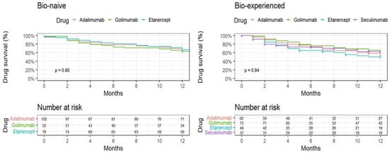 The Kaplan–Meier analysis (Figure 2) shows similar survival rates for ADA, GOL, and ETN among the biologic-naïve group (p = 0.85). Among the biologic-experienced group, after 12 months, GOL and SEC displayed similar drug survival rates, followed by ADA and ETN; however, the results did not reach statistical significance (p = 0.94).