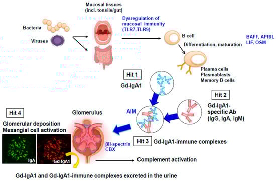 - Kano, T.; Suzuki, H.; Makita, Y.; Nihei, Y.; Fukao, Y.; Nakayama, M.; Lee, M.; Kato, R.; Aoki, R.; Yamada, K.; et al. Mucosal immune system dysregulation in the pathogenesis of IgA nephropathy. Biomedicines 2022, 10, 3027. [Google Scholar] [CrossRef] [PubMed]