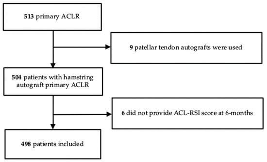 During the inclusion period, 504 patients who underwent primary ACLR met the inclusion criteria. Nine patients were excluded because a graft different from a hamstring autograft (patellar tendon) was used for their reconstruction, and six more were excluded because the ACL-RSI score at 6months was missing (Figure 1).