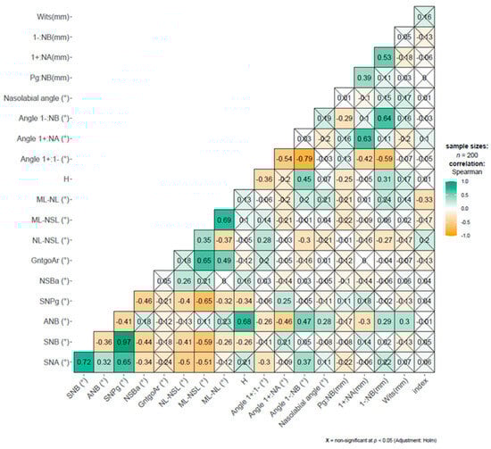 The comparative analysis of two independent groups was conducted using Welch’s t-test for variables with normal distribution, and the Wilcoxon rank-sum test for the other variables. The correlations between numerical variables were quantified using Spearman’s rho. The correlations of the cephalometric variables were visually presented as a correlation matrix.