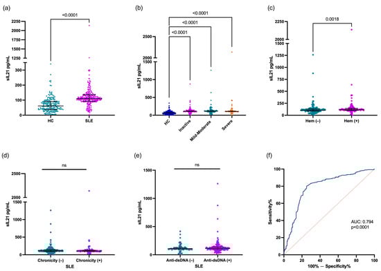 Evaluation of IL-21 levels according to clinical characteristics in patients with SLE. Comparison of IL-21 levels between HCs and patients with SLE (a), IL-21 levels according to disease activity (b), hematological domain (c) and chronicity (d), IL-21 levels according to anti-dsDNA status (e), and IL-21 performance as biomarker diagnosis in SLE (f). Patients with SLE were stratified according to Mex-SLEDAI score as follows: inactive (0–1), mild–moderate (2–6), and severe (≥7) disease. Hematological domain (Hem) included lymphopenia (<1.2 × 103/µL), leukopenia (<4.0 × 103/µL), thrombocytopenia (<100 × 103/µL), and hemolytic anemia. Data are shown as median and IQR. p-value was obtained through Mann–Whitney U test, Kruskal–Wallis test with Dunn’s post hoc test, and Spearman’s correlation test, according to case. Area Under the Curve was calculated through ROC curves. ns, no significative.