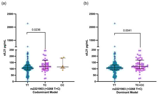 According to the rs2221903 polymorphism, SLE carriers of the CT genotype showed higher IL-21 levels [120.7 pg/mL (IQR 99.8–166.9)] than carriers of the TT genotype [107.8 ng/mL (91.6–130.5)] with a statistical difference (p = 0.0236, Figure 3a). This finding was consistent when comparing the IL-21 levels through the dominant model [TT vs. TC+CC, 107.8 pg/mL (IQR 91.6–130.5) vs. 118.2 pg/mL (IQR 101.5–167.6), p = 0.0041, Figure 3b)]. In contrast, the IL-21 levels were similar when analyzed according to the rs2055979 genotypes as well as for the rs2055979 and rs2221903 haplotypes (Figure S1).