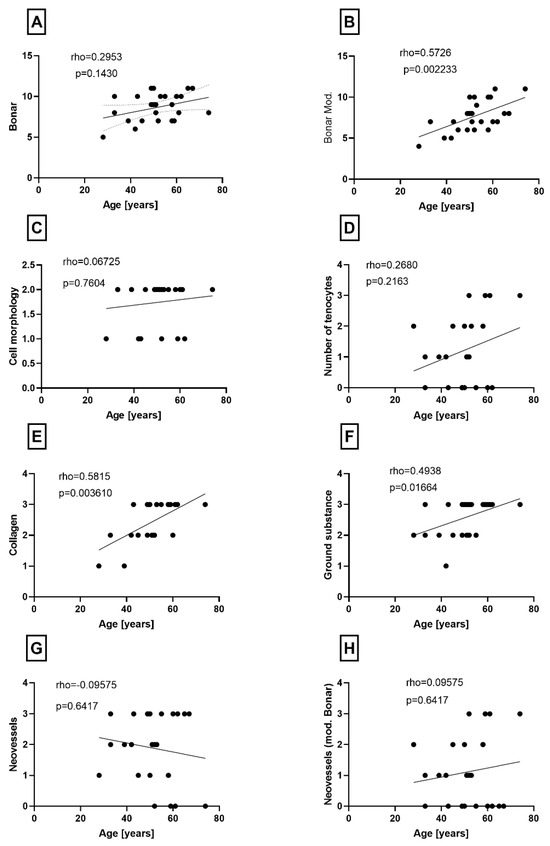 (A) Correlation between Bonar and (B) modified Bonar scores and age. Correlation between (C) tenocyte morphology, (D) number of tenocytes, (E) transformations observed in collagen, (F) transformations observed in ground substances and age. Correlation between (G) expansion of neovessels, (H) and neovessels according to modified Bonar scale and age.