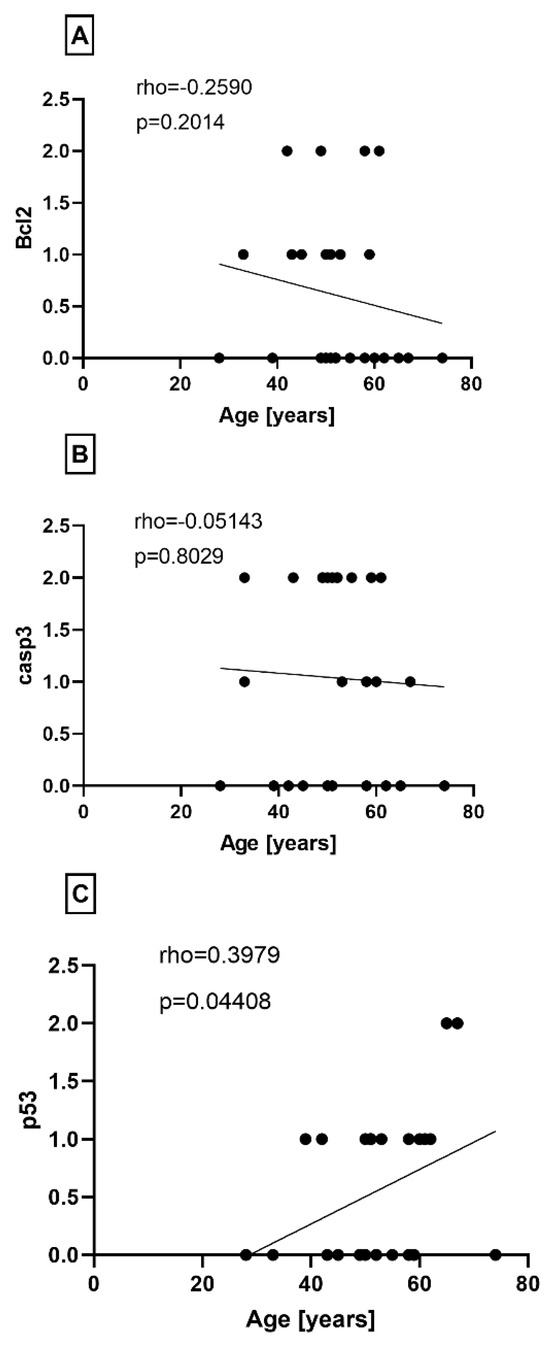Correlation between the (A) BCL2, (B) cleaved caspase 3 index, and (C) p53 index and the age of patients.