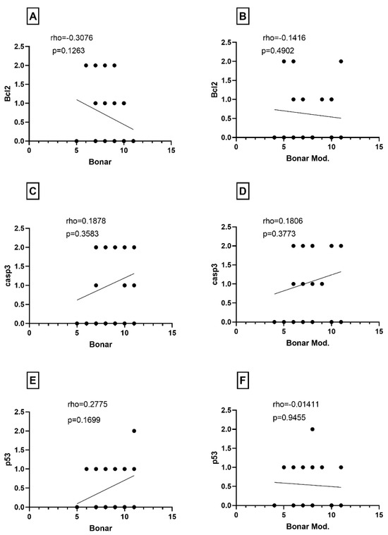 Further analysis of the relationship between age and apoptotic marker expression revealed no correlation between the age of patients and the expression indexes of BCL-2 and casp3 (Figure 2A,B). However, the expression of the p53 index showed a positive correlation with patient aging (p = 0.0441) (Figure 2C). Furthermore, there was no correlation observed between the expression of apoptotic indexes (BCL-2, cleaved caspase 3, p53) and both the original and modified Bonar scores (Figure 3). While the separated components of the Bonar scale (tenocyte morphology, collagen architecture, ground substance accumulation, and neovascularization) were analyzed for correlation with the studied apoptotic indexes, no statistically significant dependencies were found in the entire comparison.