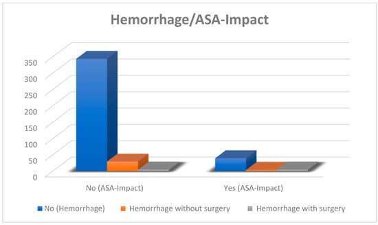 Four patients in the ASA impact group and four patients in the No ASA impact group experienced postoperative hemorrhage requiring surgical intervention. Patients treated with ASA had a significantly increased risk of postoperative hemorrhage (p 0.007).