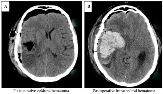 The degree of vascularization of operating lesions may influence the development of postoperative intracranial hemorrhage. Kalfas and Little observed that tumors, particularly meningiomas, were associated with the highest incidence of secondary bleeding in intracranial surgeries [33]. This finding is supported by similar reports from other researchers. The pathomechanisms underlying the elevated risk of secondary hemorrhage in hypervascularized processes such as meningiomas may involve pathological vessel walls and the activity of tumor-specific enzymes and growth factors [33,34]. Although a platelet count below 150/mL has been linked to an increased risk of pICH [35], this association was not statistically confirmed in our study due to the limited number of patients with thrombocytopenia. In a small number of patients with pICH and pathologic PTT, INR, or Quick values, statistical calculation regarding pICH was not presentable. Several pertinent risk factors for pICH, including preoperative and early postoperative hypertensive crises [36,37,38], vasculopathy-associated diabetes mellitus [39], cerebral amyloid angiopathy [40], factor XIII deficiency [1], or alcohol abuse [41], have been identified by other researchers but were not specifically investigated in this study. Nonetheless, these factors represent crucial observations highlighted by various authors and warrant consideration in future studies. Specifically, the patients with pICH experienced a significant deterioration in both Glasgow Outcome Scale (GOS) and Karnofsky Performance Scale (KPS) scores after surgery. Such outcomes underscore the devastating consequences of postoperative bleeding in affected patients.