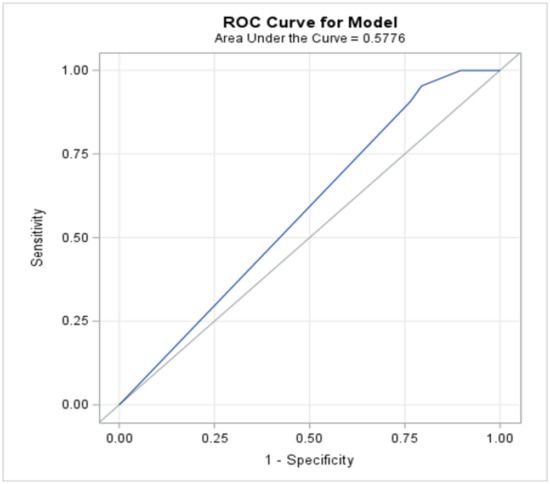 Pelvic pain was also analyzed as a group including diagnoses of pelvic pain, dysmenorrhea, and dyspareunia together. Although there was a significant association with the presence of endometriomas when pelvic pain diagnoses were grouped together (p = 0.0370), a receiver operating characteristic curve (AUC 0.57) and multivariable logistic regression model (p = 0.4708) both showed poor predictive accuracy (Figure 3).