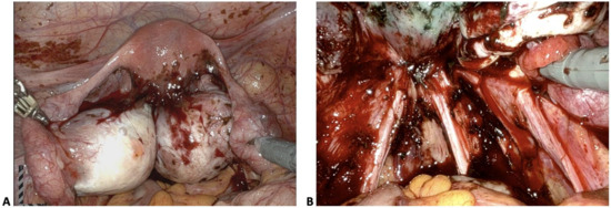 (A) Bilateral endometriomas with kissing ovaries and dense adhesions to posterior uterus. (B) Endometriotic lesions along bilateral uterosacral ligaments and deep infiltrating endometriosis of posterior cul-de-sac in a patient with bilateral ovarian endometriomas.