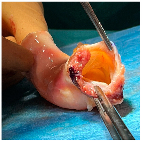 After defrosting the graft is trimmed as appropriate. The right, left, and non-coronary cusps are visible (lower and upper left, and right position in the image), whereas septal muscle is identifiable on the lower left aspect, opposite to the subaortic curtain and anterior mitral leaflet. During implantation, the latter may be preserved to reinforce the posterior aortic annulus, which represents the most common site of periannular abscess.