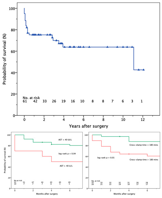 At a median follow-up of 31 [4–60] months (mean, 39.8 ± 40.7 months), 12 patients died after hospital discharge. In the Kaplan–Meier analysis, the probabilities of survival (±standard error) at 3 and 6 months were 86.3 ± 4.7% and 82.0 ± 4.9%, respectively (Figure 2, upper panel). Thereafter, the probability of late death declined less steeply, with an estimated survival of 75.2 ± 5.6 and 70.0 ± 6.3%, 1 and 3 years after surgery. The survival estimates were significantly lower in the case of AST ≥ 40 IU/L (log-rank p = 0.04) and aortic cross-clamp time ≥ 180 min (p = 0.01), but not when excluding operative mortality. The corresponding Kaplan–Meier plots, limited to the first 6 postoperative months, are shown in Figure 2, lower panels. No multivariable predictors of late death or adverse events could be outlined when confining the analysis to operative survivors.