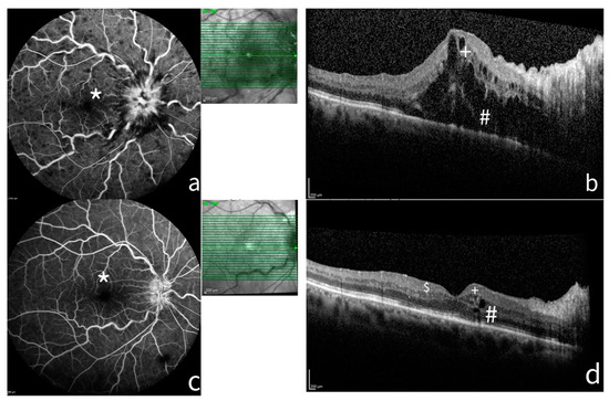 A case of CRVO at baseline and six months after treatment. FA and SD-OCT of a patient before and after treatment. (a) FA shows a non-ischemic (*) central retinal vein occlusion (CRVO) with marked delay in arteriovenous transit time, masked by retinal haemorrhages, and vessel wall staining. (b) The SD-OCT shows ME with considerable central thickness, absence of DRIL (+), and incomplete disruption of ELM and EZ. (c) After six months of treatment, FA shows resolution of the RVO with late staining of optic disc. (d) The SD-OCT highlights the reduction in retinal thickness, the presence of HRF ($), resolution of photoreceptor layers (#), and absence of DRIL (+). FA: Fluorescein angiograms; SD-OCT: spectral domain–optical coherence tomography; ME: macula edema; DRIL: disorganization of retinal inner layers; ELM: external limiting membrane disruption; HRF: hyperreflective foci; EZD: ellipsoid zone disruption.