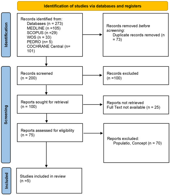 As presented in the PRISMA 2020 flow diagram (Figure 1), from 273 records identified by the initial literature searches, 268 were excluded and 5 articles were included (Table 1). The quality of the studies was assessed with the PEDro scale (Table 2), AMSTAR 2, and ROB2 (Table 2).