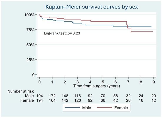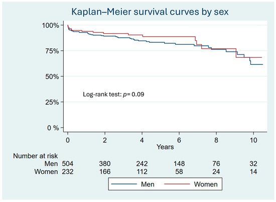 Thirty men (15.3%) died in the matched sample compared to twenty-eight (14.3%) women. The Kaplan–Meier survival curves show that sex was not an independent risk factor for long-term mortality, as determined by the log-rank test (p = 0.23) (Figure 3). Cox regression analysis showed an HR of 1.11 (95% CI 0.65–1.9).
