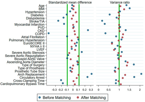 Balancing diagnostics of the baseline characteristics of men and women undergoing ascending aortic aneurysm surgery showing variables before (blue circles) and after (red circles) propensity score matching. The mean standardized difference after matching includes all the variables within the range of −0.1 to 0.1 (Green lines). Likewise, in the variance ratio, variables tend to be 1, indicating that the propensity score was effective in controlling differences among men and women.