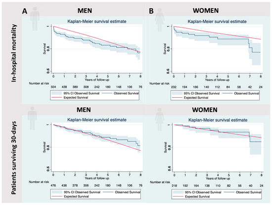 (A). Observed survival (OS) and expected survival (ES) for all men. The reference population’s ES (red line) is greater than our sample’s OS. After including men surviving the postoperative period, the ES is included within the 95% CI (blue sector) of the OS. (B). OS and ES for all women. The reference population’s ES (red line) is greater than our sample’s OS. After including women surviving the postoperative period, the ES is included within the 95% CI (blue sector) of the OS.