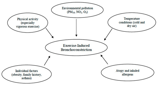 Additional risk factors contributing to the prevalence of EIB include allergic rhinitis, a personal history of allergies, and atopic dermatitis [55]. Indeed, according to epidemiological evidence, as many as 40% of infants with allergic rhinitis suffer from EIB, especially those with persistent untreated signs and symptoms. Therefore, exploring these symptoms could be crucial for this condition, since a targeted nasal treatment might help improve EIB [19]. Studies have shown that atopy, elevated IgE levels, and sensitization to house dust mites are linked to EIB [37,78]. For instance, a Belgian study found that atopic swimmers with total IgE levels above 100 kIU/L had a higher risk of developing childhood asthma [79]. In addition, in the study conducted by Lin et al., with the aim to explore the prevalence and predictors of EIB in children with asthma, EIB was observed in 52.5% of the asthmatic children. Those with EIB were more likely to suffer from atopic dermatitis (p = 0.038) and had higher rates of allergy to Dermatophagoides pteronyssinus and Dermatophagoides farinae compared with those without EIB (p = 0.045 and 0.048, respectively) [60]. Likewise, other authors discovered a relationship between exposure to cat allergens and an increase in cough/bronchoconstriction during physical education in a large urban population of school children [17]. Therefore, atopy remains a significant risk factor among sensitized school children, even in the absence of asthma [26]. Furthermore, sensitization to outdoor and indoor allergens, as well as polysensitization rather than monosensitization, significantly increased the risk of EIB in children aged 5 to 10 years [26] (Figure 1).