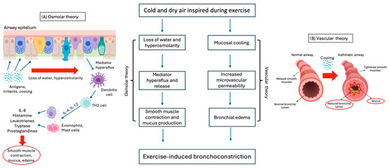 On the other hand, the “thermal or vascular theory” (Figure 2B) consists in bronchial vasoconstriction and subsequent rapid rewarming with vasodilation following contact with cold air. As a result, vascular congestion and increased microvascular permeability lead to bronchial edema and bronchoconstriction [17,62,82].