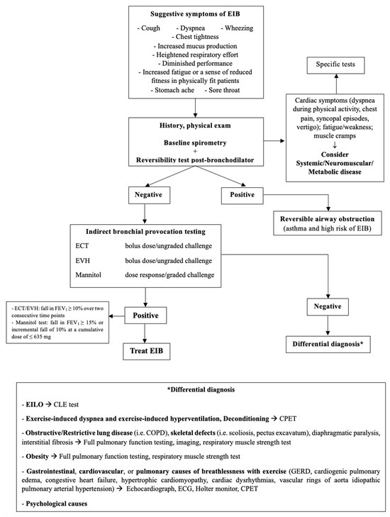Diagnostic flowchart for EIB. EIB: exercise-induced bronchoconstriction; ECT: exercise challenge test; EVH: Eucapnic Voluntary Hyperpnea; EILO: Exercise-Induced Laryngeal Obstruction; CLE: Continuous Laryngeal Exercise Test; CPET: Cardio-Pulmonary Exercise Test; COPD: Chronic Obstructive Pulmonary Disease; GERD: Gastro-Esophageal Reflux Disease; ECG: electrocardiogram.