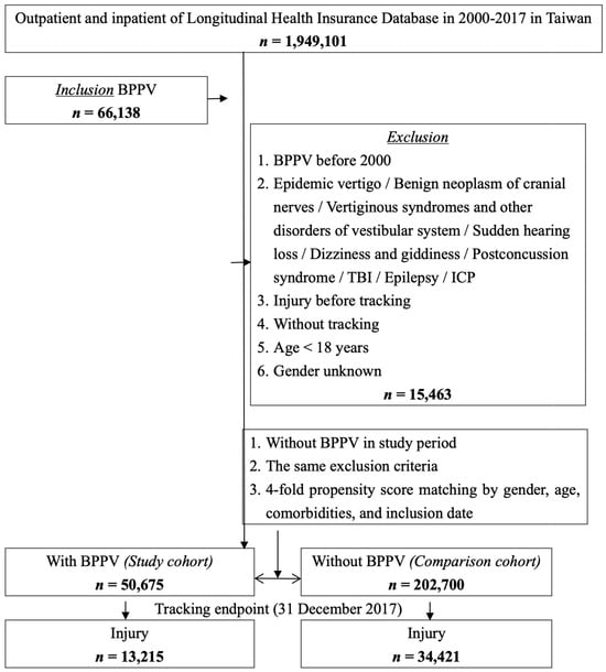 We included patients with a history of at least 3 diagnoses of BPPV, which was made based on the characteristics of episodic positional vertigo and physical examination such as the Dix–Hallpike maneuver. The diagnoses were made by an otolaryngologist or neurologist in the outpatient or emergency department or upon admission. The patients who received BPPV diagnoses exclusively from non-otolaryngologists or non-neurologists were excluded. The following patients were excluded: (1) those with a history of BPPV before 2000; (2) those with diseases that might cause vertigo or dizziness prior to the index date; (3) those under 18 years of age; (4) those with a diagnosis of injury before the index date; and (5) those with incomplete demographic data. The index date for this cohort was when the patients met the inclusion criteria, which meant the third diagnosis of BPPV if at least 3 times BPPV coding was defined. Subsequently, for each patient in the BPPV cohort, 4 patients without a history of BPPV were selected from the LHID2005 database through propensity score matching based on gender, age, comorbidities, and the year of the index date of the cases. Patients who met the same exclusion criteria as those for patients with BPPV were excluded.