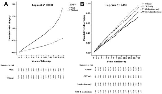 Results of Kaplan–Meier and log-rank test analysis for cumulative risk of all-cause injuries stratified by (A) benign paroxysmal positional vertigo, BPPV, and (B) treatment with and without canalith repositioning therapy (CRT) or medications. There was a statistically significant difference between the experiment and control groups (significant p-value was <0.05).
