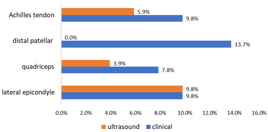 Prevalence of positive clinical and ultrasound findings on enthesis examination (n = 51).