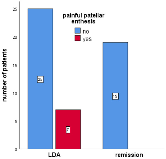Compared to patients in DAPSA-defined remission, patients in LDA had a significantly higher prevalence of painful right patellar enthesitis on clinical examination (21.9% compared to none; p = 0.028; Figure 3). There were no other significant differences among patients in remission or LDA regarding clinical examination and ultrasound examination of entheses.