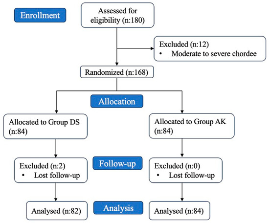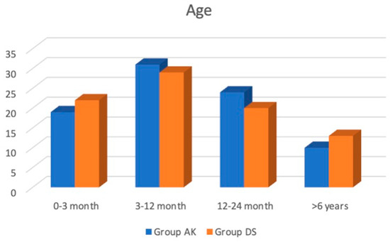 A total of 180 patients were enrolled in our study. For the final analysis, 166 patients were included, with 82 in Group DS and 84 in Group AK. The participants’ ages were distributed across four categories: 0–3 months, 3–12 months, 12–24 months, and over 6 years. There was no significant difference in age distribution between the two groups (p = 0.791). Specifically, in Group AK, 19 (22%) were aged 0–3 months, 31 (37%) were aged 3–12 months, 24 (29%) were aged 12–24 months, and 10 (12%) were older than 6 years. In Group DS, 22 (26%) were aged 0–3 months, 29 (35%) were aged 3–12 months, 20 (24%) were aged 12–24 months, and 13 (15%) were older than 6 years (Figure 4).