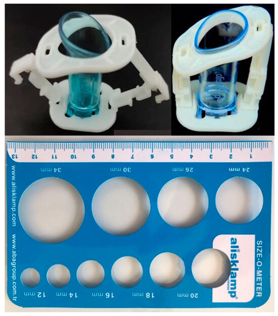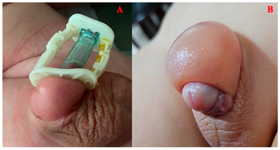 Prior to applying the Alisklamp device, the size of the penis was determined using a template from the Alisklamp device (AKD) kit (Figure 2). The process begins by fitting a device tube over the prepuce, ensuring the preputium is pulled up over the tube. The lengths of the mucosa and skin to be cut were then adjusted accordingly, and the clamp was secured by closing the upper and lower arms of the AKD. For cases involving tight phimosis, a 3–5 mm dorsal slit was made to fully separate the inner and outer preputial layers. The Alisklamp was subsequently removed by the surgeon 24–48 h after the surgery (Figure 3). Once all preputial adhesions were dissected, the coronal sulcus just behind the glans penis was completely exposed. The preputium was drawn back to its neutral position, and the 12 and 6 o’clock positions were marked for reference. The penile skin was then retracted through the pubis using finger pressure at the base of the penis, and the coronal sulcus projections were marked. These markings are essential in defining the estimated skin length of the erect penis. Following this, an inner tube was inserted inside the preputium. If the preputial neck was too narrow to allow the tube’s insertion, a dorsal slit was made to facilitate the process. With the outer chamber set in an unlocked position, the inner mucosa was tailored using an external light source for transillumination, which helps in determining the mucosal incision level. The locked arms were then set at the 6 and 12 o’clock positions. The outer chamber was positioned just above the coronal sulcus markings, and the arms were locked. An incision was carried out, leaving a 1- or 2 mm safety margin over the locked chamber. No dressing is needed in the Alisklamp technique [15,17]. Alisklamp removal is a quick procedure, taking only 5 s and requiring no local anesthesia.