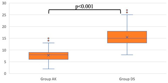 The operation times (skin to skin, without dressing time) for the two groups showed a significant difference. In Group AK, the average operation time was 7.8 ± 2.6 min, whereas in Group DS, the average operation time was 15.5 ± 4.5 min (p < 0.001) (Figure 6).