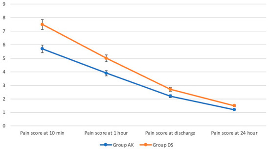 The pain scores for the two groups were compared at various time points post operation. At 10 min, the pain score for Group AK was 5.7 ± 1.6, while for Group DS, it was 7.5 ± 1.9, (p < 0.001). At 1 h post operation, Group AK had a pain score of 3.9 ± 1.8 compared to 5 ± 1.9 in Group DS (p = 0.04). Upon discharge, the pain score for Group AK was 2.2 ± 0.8, whereas for Group DS it was 2.7 ± 1.2, with no significant difference (p = 0.129). At 24 h post operation, the pain score for Group AK was 1.2 ± 1, compared to 1.5 ± 1.2 for Group DS, also showing no significant difference (p = 0.235) (Figure 7).