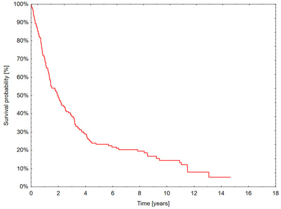 The median patient survival was 1.95 years. Of the studied patients, 69.9% survived one year, 48.8% two years, and 38.3% three years; five-year survival was achieved by only 23.1% (Figure 1).
