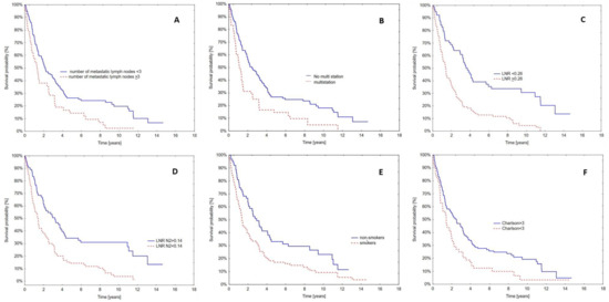 Kaplan–Meier survival curves of patients included in the study. (A) Number of metastatic lymph nodes; (B) single-/multistation; (C) LNR; (D) LNR N2; (E) smoking history; (F) Charlson Index.