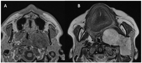 The parapharyngeal space (PPS) has the shape of an inverted pyramid, extending from the base of the skull (temporal bone) to the hyoid bone, bounded from behind by the vertebral column and prevertebral muscles, from the adventitia by the buccopharyngeal fascia, and from the side by the condyle of the mandible and medial pterygoid muscle. The styloid process divides it into two compartments: anterior-prestyloid and posterior-poststyloid (carotid space) [1]. The vast majority of tumors developing in the prestyloid space originate in the salivary glands [1,2,3]. PPS involvement of parotid tumors has two forms. In the first (Figure 1A), the neoplasm develops in the PPS from the medial protuberance of the deep lobe in an isolated manner, but in continuity with the deep lobe, while in the second, the tumor of the deep part (the so-called deep lobe) or the entire gland grows medially through the stylomandibular tunnel (Figure 1B).