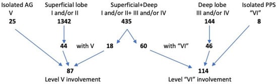 Quer, in response to a letter to the editor regarding the necessity of addition of a new level to the ESGS classification, stated that “the resection of levels III–IV theoretically includes any parapharyngeal extension of the parotid gland, so I do not see a resection of levels III-IV preserving the parapharyngeal extension” [7]. The authors of this study cannot agree with this statement, since the extent of resection of levels I–V in PPS involvement varies depending on the tumor starting point (level), size, histology, and preferences of the operating surgeon, as depicted in the data shown in Table 4. Multiple techniques are used to obtain surgical access to deep lobe tumors with PPS involvement, and transparotid-transcervical approaches are the most frequently performed. However, it is possible to resect a PPS tumor (isolated but in continuity with the deep parotid lobe) from a transoral access, without removing levels III and/or IV. Transoral-only access is deba but can be considered on par with extracapsular dissection (ECD) of tumors of other levels, especially with endoscope-assisted or transoral robotic surgery (TORS). In cases of involvement of the prestyloid portion of the PPS by dumbbell parotid tumors, dual access (transparotid with transoral) is common, and for extremely large or recurrent tumors, as well as carcinomas, sometimes a wide transparotid–transcervical access in combination with mandibulotomy is necessary [3,8,9,10,11,12,13,14,15,16].