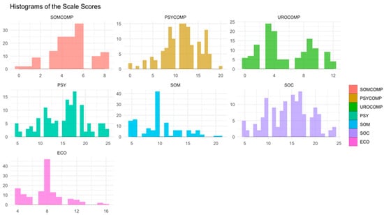 Histogram of the scale scores. SOMCOMP: somatic subscale of the Menopause Symptom Assessment Scale, PSYCOMP: psychological subscale of the Menopause Symptom Assessment Scale, UROCOMP: urogenital subscale of the Menopause Symptom Assessment Scale, PSY: psychological subscale of the Coronavirus 19 Phobia Scale, SOM: somatic subscale of the Coronavirus 19 Phobia Scale, SOC: social subscale of the Coronavirus 19 Phobia Scale, ECO: economic subscale of the Coronavirus 19 Phobia Scale.