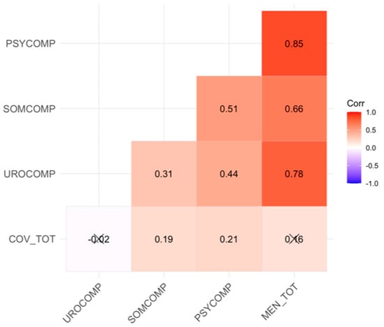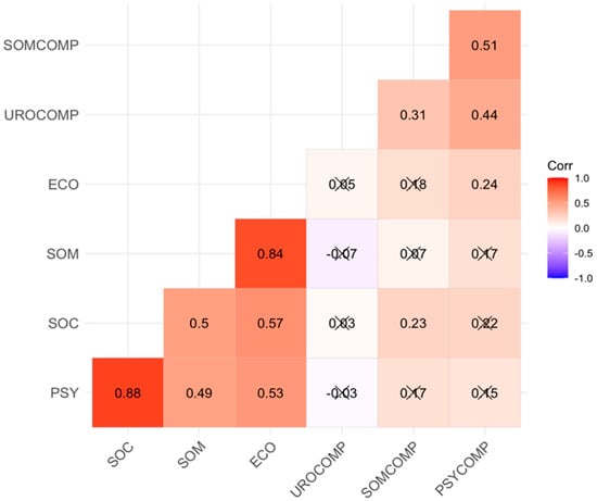 Correlation plot of the scale scores. The symbol X points out the insignificance of the correlation coefficient.