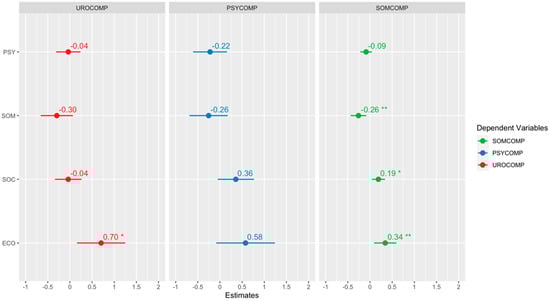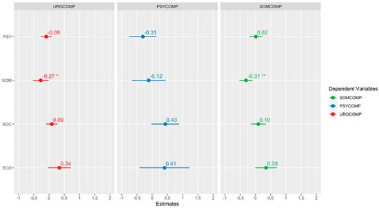 All the statistical implementations were performed via R software 4.3.1. []. We considered the error level as α = 0.05 for the statistical interpretations. A Spearman correlation analysis was used, and the scatter plot was given to represent the relationships using the ggcorrplot package []. Since the normality does not hold for the scale scores (i.e., responses), we conducted a quantile regression analysis []. In the regression part, we considered the subscales of the menopausal symptom assessment scale as dependent variables. We presented the regression findings benefiting data visualization methods via the sjPlot package [].
