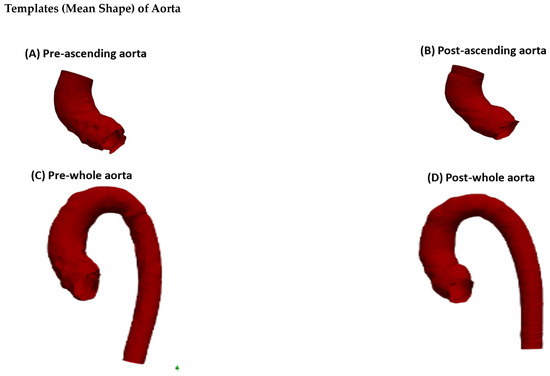 Templates of ascending and whole aortas pre- and post-operatively. (A) Pre-operative ascending aorta template from 47 aortas. Lambda stiffness and resolution: 35 mm and 11 mm, respectively. (B) Template of post-operative ascending aorta from 35 ascending aortas. Lambda stiffness and resolution: 33 mm and 11 mm, respectively. (C) Template of pre-operative whole aorta from 46 patients after excluding the patient with stent. Lambda stiffness and resolution: 45 mm and 11 mm, respectively. (D) Template of post-operative whole aorta from 35 aortas. Lambda stiffness and resolution: 45 mm and 13 mm, respectively.