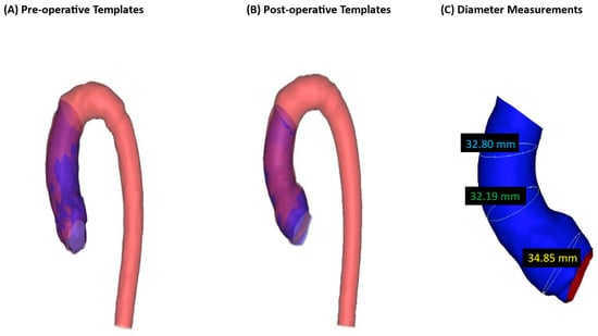 Three measurements were taken at the aortic root, the mid-ascending aorta, and the distal part of the ascending aorta (Figure 2C) for both the ascending aorta model and the whole aorta model in order to measure the diameter difference. This was carried out to evaluate the SSM’s template construction accuracy. For the pre-operative ascending aorta, the measurements were: 36.19 mm, 39.48 mm, 36.57 mm; for the whole aorta, the measurements were: 36.19 mm, 39.53 mm, 35.68 mm, indicating a sub-millimetre difference overall. For the post-operative ascending aorta, the measurements were: 34.85 mm, 32.19 mm, 32.80 mm; for the whole aorta, the measurements were: 33.60 mm, 33.56 mm, 33.36 mm, indicating a difference ranging from sub-millimetre to 1.37 mm. This signifies that the SSM was accurate in producing matching templates (ascending aorta and whole aorta) despite different lambda parameters for each. Aortic diameter measurements are reported in Table 3.