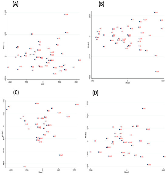 PCA scatterplots of Mode 1 vs. Mode 2 for the pre-operative and post-operative ascending and whole aortas. (A) Pre-operative ascending aortas; (B) Pre-operative whole aortas; (C) Post-operative ascending aortas; (D) Post-operative whole aortas. In all scenarios, there is no clear distinction between the surgical groups, except for the Ross where they tend to mostly cluster together. The Ross shapes have a tendency of having negative values for Mode 1 suggesting small aortas. This clustering also shows that the Ross have less variability compared to the other surgical groups. Many of the AVR points also seem to cluster together, but other points are also dispersed throughout the plot, indicating greater variability. The Ozaki points are moderately spread out but less in comparison to the AVR group. The valve-sparing group is too small to yield meaningful results. AVR: aortic valve replacement; OZ: Ozaki; R: Ross; VS: valve-sparing.