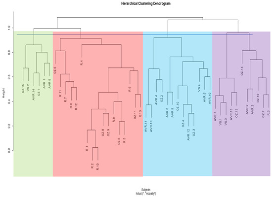 Hierarchical cluster dendrogram of pre-operative ascending aortas. Height represents extent of dissimilarity between clusters. Cut-off line was placed at height of ~1.0, resulting in four clusters. Linkage method and distance metric used were McQuitty (WPGMA) and correlation respectively. AVR: aortic valve replacement; OZ: Ozaki; R: Ross; VS: valve-sparing. The numbers following acronyms represent patient number. * Hierarchical cluster analysis; McQuitty linkage method and correlation distance.