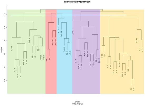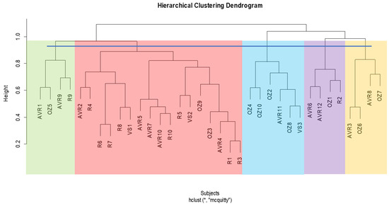 Hierarchical cluster dendrogram of post-operative whole aortas. Height represents extent of dissimilarity between clusters. Cut-off line was placed at a height of ~0.95–1.0 resulting in five clusters. Linkage method and distance metric used were McQuitty (WPGMA) and correlation respectively. AVR: aortic valve replacement; OZ: Ozaki; R: Ross; VS: valve-sparing. The numbers following acronyms represent patient number. * Hierarchical cluster analysis; McQuitty linkage method and correlation distance.