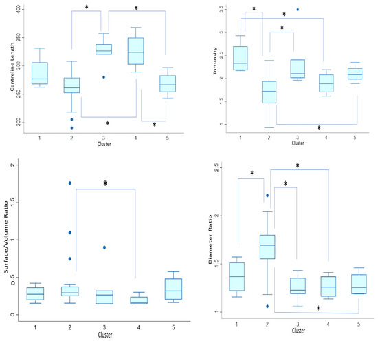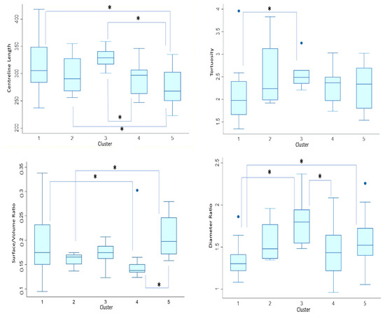 Post-operative Dunn’s Pairwise comparison represented by boxplots of centreline length, tortuosity, surface area/volume ratio, and ascending/descending aorta diameter ratio by cluster. Median value is represented by line within box, height of box demonstrates interquartile range, and whiskers demonstrate maximum and minimum values. * signifies statistical significance of p < 0.05. Blue dots signify outliers.