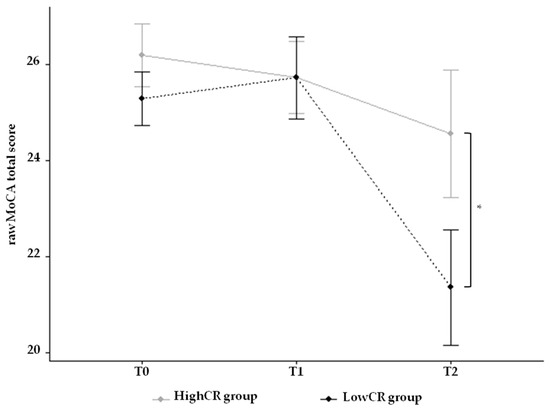 Changes in total MoCA score between HighCR and LowCR groups over time (T0, T1, T2). Asterisk denote statistically significant differences at long-term follow-up (T2). Data are presented as mean and SE.