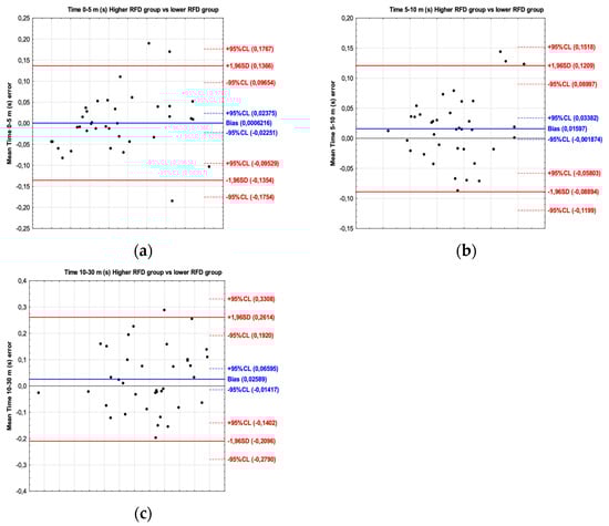 Bland–Altman plot showing the agreement between football players with a higher braking RFD and a lower braking RFD for the time 0–5 m (a), time 5–10 m (b) and time 10–30 m (c) sprint test intervals.