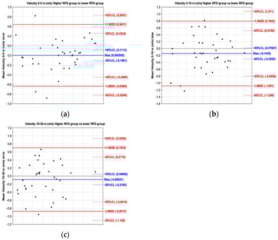 For the sprint velocity, the results of the Bland–Altman plot have shown bias between players with a higher and lower braking RFD. The mean difference for velocity 0–5 m was 0.002 m/s (limit of agreement from −0.636 to 0.641); for velocity 5–10 m, the mean difference was −0.143 m/s (limit of agreement from −1.081 to 0.794); and for velocity 10–30 m, the mean difference was −0.085 m/s (limit of agreement from −0.873 to 0.703) (Figure 2).