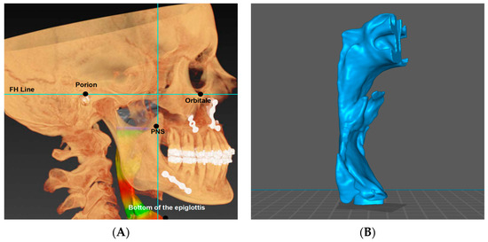 (A) Cephalometric skeletal landmarks with UA reconstruction; (B) 3D visualization of the UA analyzed according to the provided protocol.