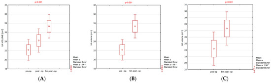 When comparing the volume of the UA before surgery, post-surgery, and 6 months post-surgery, the obtained p-value was <0.001, indicating statistically significant differences in UA volume between the successive examinations. After applying the paired t-test, statistically significant differences were found between UA volume before surgery and 6 months post-surgery, and between UA volume after surgery and 6 months post-surgery, with the obtained p-values being <0.001 and 0.001, respectively. A significantly larger UA volume was observed 6 months post-surgery (mean ± SD: 27.3 ± 7.3) compared to the volume before the surgery (mean ± SD: 22.2 ± 6.4), as well as 6 months post-surgery compared to the volume assessed shortly after the surgery (mean ± SD: 24.2 ± 7.3). (Table S1; Table 2; Table 3; Figure 2A–C).
