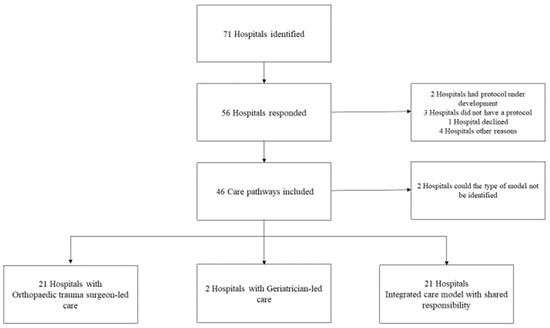 Out of 71 contacted hospitals, 56 responded (response rate 79%). Among them, 46 (82%) hospitals shared their care pathways. Four of the responding hospitals were affiliated with universities. Ten hospitals could not provide a care pathway: two had a care pathway under development, three did not have one, four hospitals did not share a written protocol but instead provided information via telephone and details about the organization, and one declined to provide it. For 44 hospitals, the type of orthogeriatric care model could be identified. The distribution was equal between hospitals with orthopedic trauma surgeon-led care (N = 21) and those with an integrated care model with shared responsibilities (N = 21). Two hospitals had geriatrician-led care (Figure 1).
